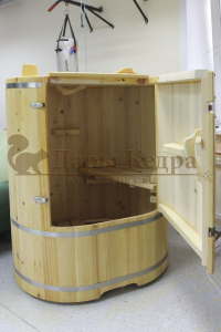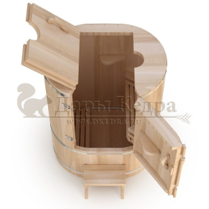Овальная фитобочка из кедра - это мини парная, которую можно использовать не только в спа-салонах, но и дома. Овальная модель более просторна и удобна в использовании. Толщина стенок составляет 40-45 мм, что позволяет увеличить срок службы изделия. Она оборудована откидными створками, дверцей и отверстием для головы. Во время парения человек сидит внутри кедровой бочки, а голова находится снаружи. Благодаря этому исключается возможность перегрева. Подлокотники из кедра, встроенные ручки на створках и двери делают эксплуатацию более удобной.