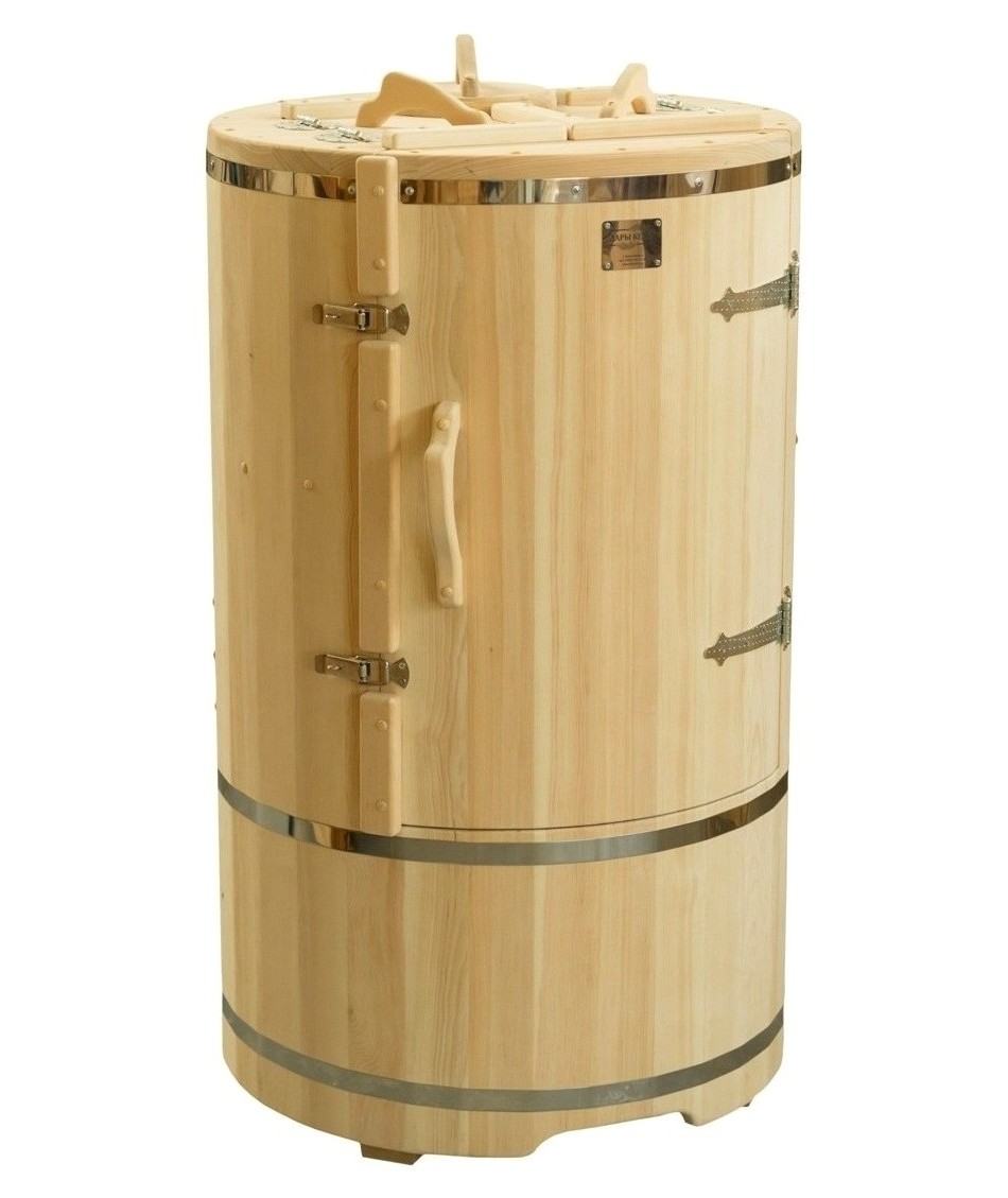 • Кедровая бочка (фитобочка) круглая «Классическая Эконом» Круглая фитобочка представляет собой мини парную, которую можно использовать не только в спа-салонах, но и дома. Бочка изготовлена из древесины кедра без отбора по сучкам, поэтому такая модель считается более доступной. Фитобочка оборудована откидными створками, дверцей и отверстием для головы. Во время парения человек сидит внутри кедровой бочки, а голова находится снаружи. Благодаря этому исключается возможность перегрева. Подлокотники из кедра, встроенные ручки на створках и двери делают эксплуатацию более удобной. Парение в фитобочке благотворно влияет на организм в целом: повышается иммунитет, выводятся шлаки и токсины, улучшается работа органов тела и состояние кожи.