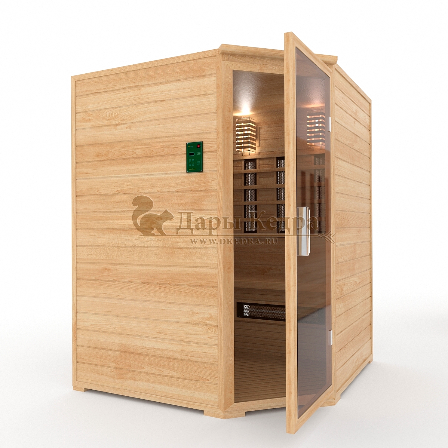 Четырёхместная угловая инфракрасная сауна кабина из кедра с керамическими излучателями Это специально оборудованная кедровая кабина для прогрева тела человека сухим теплом. Воздух в таких парных не нагревается. Инфракрасные лучи воздействуют на тело, равномерно прогревая мышцы, суставы и органы. Керамические излучатели похожи на лампы, имеют высокую температуру нагрева, поэтому защищены противоожоговыми решетками. Тело человека в таких саунах нагревается интенсивнее. Работает кабина за счет электричества. Установка сауны в угол, позволяет рационально использовать пространство помещения. Подходит как для домашнего использования, так и для коммерции. Обращаем Ваше внимание что в стандартную комплектацию входит трапик для ног, но вы можете его заменить на цельный пол совершенно бесплатно! Целебная древесина кедра и инфракрасные лучи благотворно влияют на организм человека в целом. При регулярном использовании инфракрасной сауны укрепляется иммунитет, улучшается кровообращение и состояние кожи, выводятся токсины.