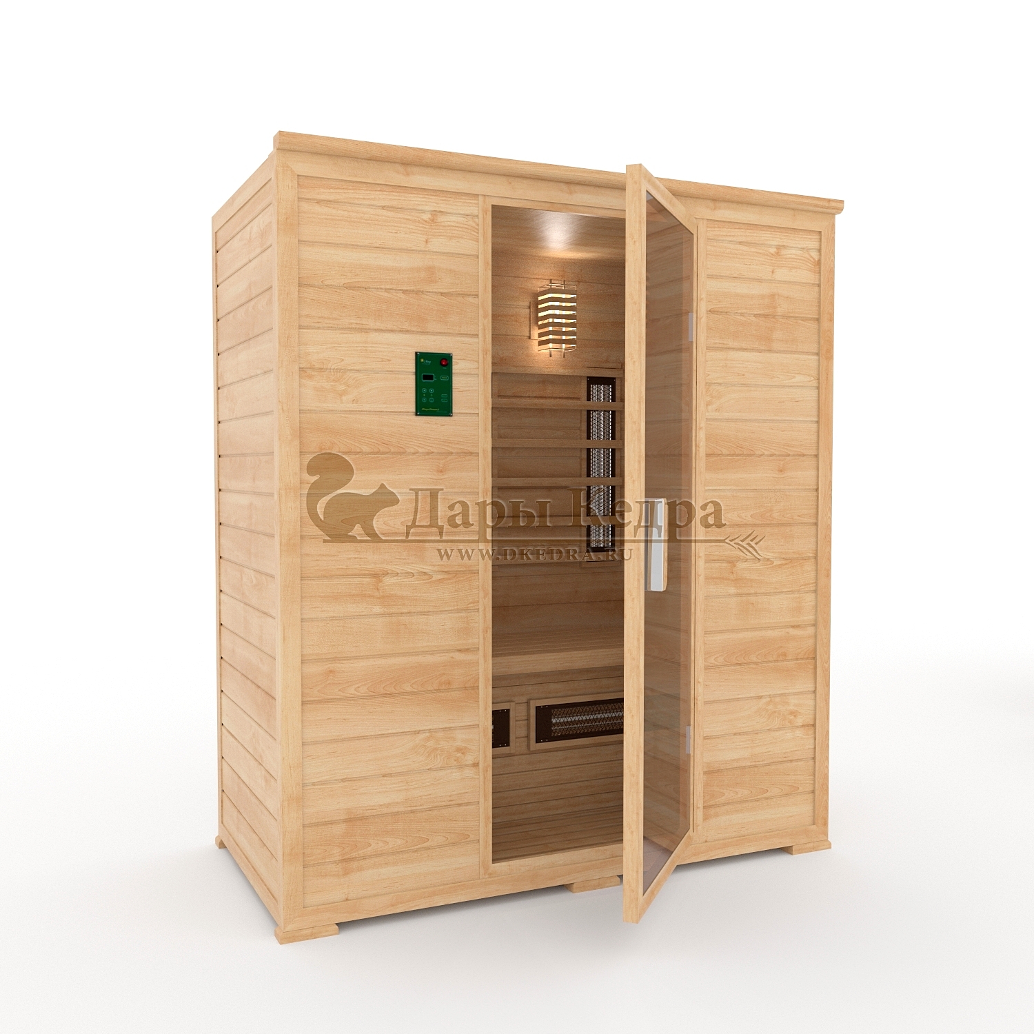 Трёхместная инфракрасная сауна кабина из кедра с керамическими излучателями Это специально оборудованная кедровая кабина для прогрева тела человека сухим теплом. Воздух в таких парных не нагревается. Инфракрасные лучи воздействуют на тело, равномерно прогревая мышцы, суставы и органы. Керамические излучатели похожи на лампы, имеют высокую температуру нагрева, поэтому защищены противоожоговыми решетками. Тело человека в таких саунах нагревается интенсивнее. Работает кабина за счет электричества. Трехместная инфракрасная сауна с керамическими излучателями подойдет как для домашнего использования, так и для коммерции. Обращаем Ваше внимание, что в стандартную комплектацию входит трапик для ног, но вы можете его заменить на цельный пол совершенно бесплатно! Целебная древесина кедра и инфракрасные лучи благотворно влияют на организм человека в целом. При регулярном использовании инфракрасной сауны укрепляется иммунитет, улучшается кровообращение и состояние кожи, выводятся токсины.