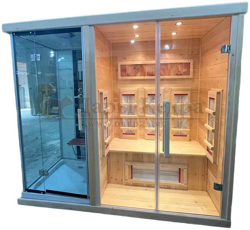 Пятиместная инфракрасная сауна кабина из кедра с керамическими излучателями Это специально оборудованная кедровая кабина для прогрева тела человека сухим теплом. Воздух в таких парных не нагревается. Инфракрасные лучи воздействуют на тело, равномерно прогревая мышцы, суставы и органы. Керамические излучатели похожи на лампы, имеют высокую температуру нагрева, поэтому защищены противоожоговыми решетками. Тело человека в таких саунах нагревается интенсивнее. Работает кабина за счет электричества. Вместительная пятиместная инфракрасная сауна с керамическими излучателями подойдет для коммерческого использования. Обращаем Ваше внимание, что в стандартную комплектацию входит трапик для ног, но вы можете его заменить на цельный пол совершенно бесплатно! Целебная древесина кедра и инфракрасные лучи благотворно влияют на организм человека в целом. При регулярном использовании инфракрасной сауны укрепляется иммунитет, улучшается кровообращение и состояние кожи, выводятся токсины.