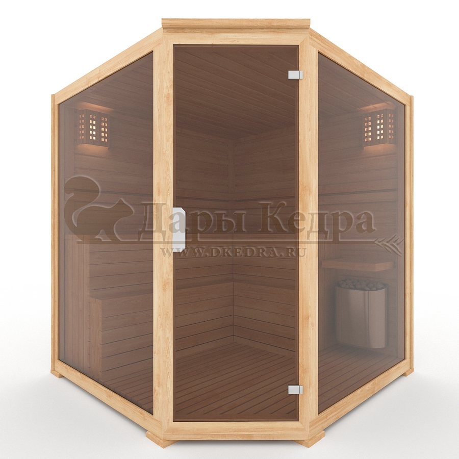 Пятиместная угловая финская сауна кабина из кедра с электрокаменкой Это специально оборудованная деревянная кабина для сухого и влажного парения. Электропечь нагревает пространство внутри и позволяет сбрызгивать камни водой, слегка увлажняя воздух. Такая процедура позволяет избежать перегрева. Двойные стенки кабины с теплоизоляционным материалом удерживают тепло. Установка сауны в угол позволяет рационально использовать пространство помещения. Финская сауна с электропечью подойдет, как для домашнего использования, так и для коммерции. Доставляется в разборном виде щитами, собирается по инструкции с помощью шуруповёрта. Обращаем Ваше внимание, что в стоимость сауны уже включена дверь с закаленным стеклом в раме из кедра с фиксатором и деревянным фасадом справа. Вы можете заменить фасад на цельностеклянный с безрамной дверью за дополнительную плату. Нагреваясь, древесина кедра выделяет полезные вещества-фитонциды, которые благотворно влияют на организм в целом и укрепляют иммунитет.
